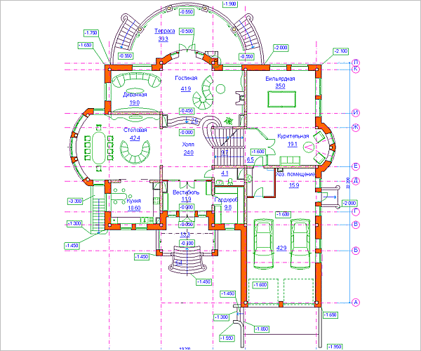 Большая часть наших проектов содержит монолитную плиту, которая является универсальным фундаментом и подходит под большинство типов грунта. Буронабивные сваи с монолитной лентой ростверка являются самым доступным решением, но чтобы реализовать это решение необходимо предоставить отчет геологии, который вы можете заказать у нас или в любой другой компании. Данный тип фундамента иногда не может быть применен к слишком большим и тяжелым домам. Экономия, по сравнению с плитой, достигает до 40%.