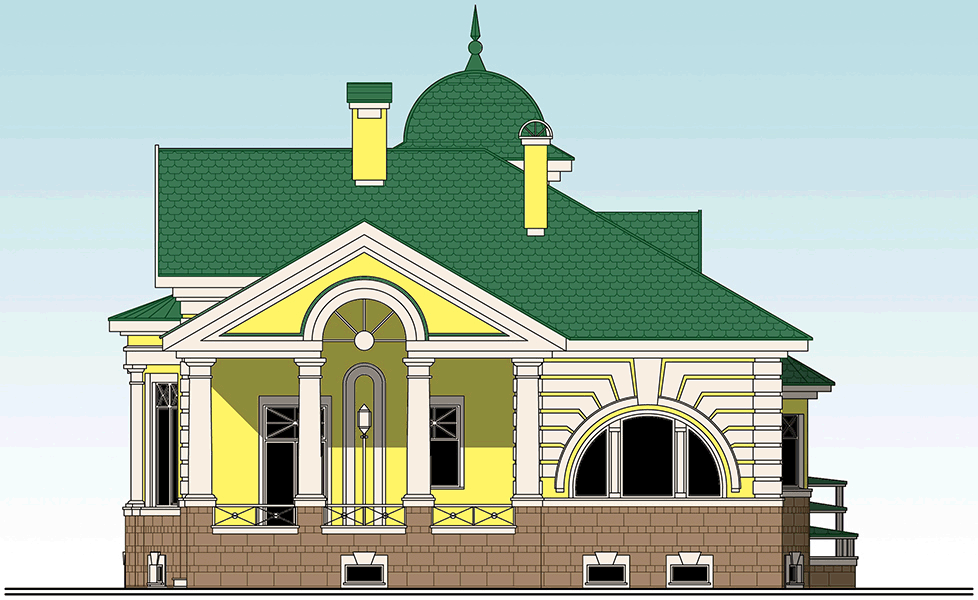 Проект двухэтажного дома в стиле барокко из керамоблока и кирпича с цокольным этажом и эркером, с размерами 12 м на 13 м EV-23