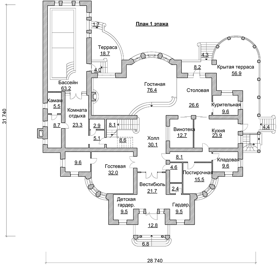 | Фасад: | цветная фасадная штукатурка, декоративная фасадная плитка, детали из натурального камня |