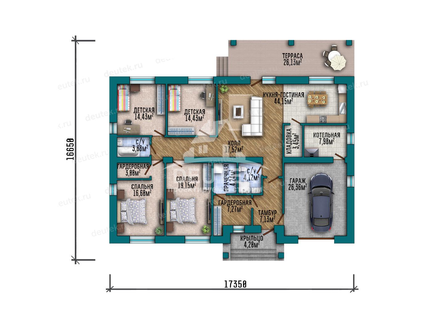 Габариты дома: 16.65 x 17.35 м